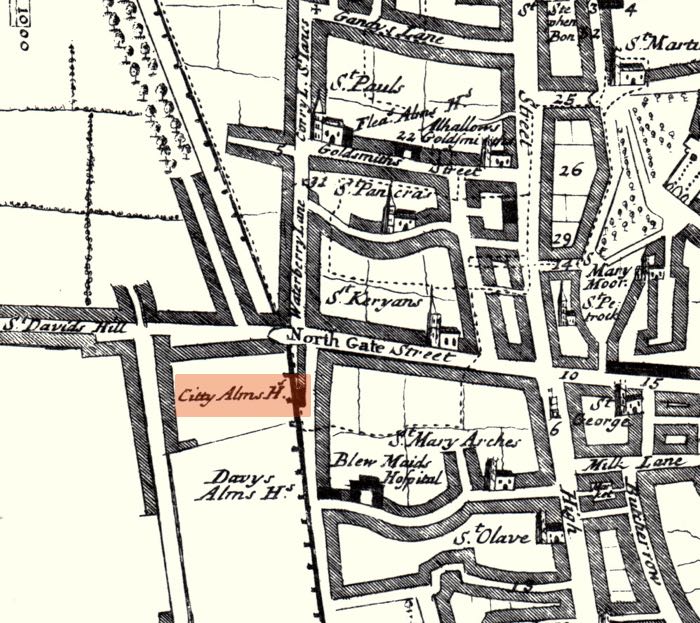 A site was found in Bartholomew Street, just between the Northgate and the already existing ‘Citty Almshouses’. It was probable that the existing almshouses were demolished for the new row of twelve almshouses. Chamber accounts recorded that the row of new almshouses cost £746, along with detailed payments to the various tradesmen. Each dwelling had a living room, with bedroom over, and at the rear a passage with scullery, water supply and water closet. The feoffees resigned their trust and handed the new development to the Chamber.