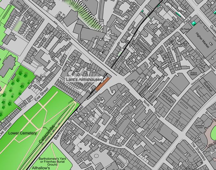 The homes for twelve poor people were inhabited until 1959, when they were demolished in the constant drive to widen Exeter’s roads. There are many in Exeter who still remember Lant’s, and some who even remember the tenants hanging over their split stable doors. All that remains is a strip of grass along the city wall between BurgerFest, in the old Malt House, and the site of the old Northgate.