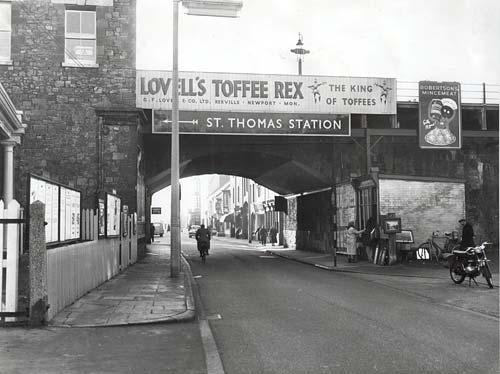 The north side of Cowick Street by the railway viaduct. The Railway Inn was just behind the lamp post – it was a City Brewery house that was closed in 1939, and demolished after the war. The National Westminster Bank is now on this site.