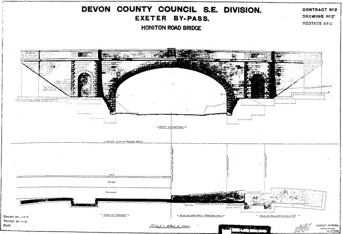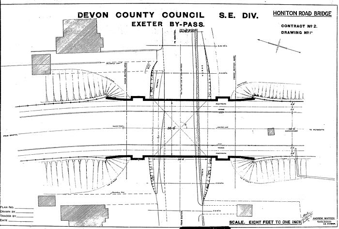 The construction of the bridge carrying the Exeter bypass over the Honiton Road, just east of Gallows Corner, was part of the second phase of the new Exeter bypass in the 1930s. The first phase, from Pinhoe Road to Hill Barton railway bridge was completed by 1933. The second phase to Countess Wear was put out to tender in September 1933, and by August 1934, was progressing well. An innovation of the route was the bridge (referred to in the press as a 'flyover') over the A30, Honiton Road, a way of avoiding a roundabout or road junction. A slip road was planned to allow access from Honiton to the bypass.