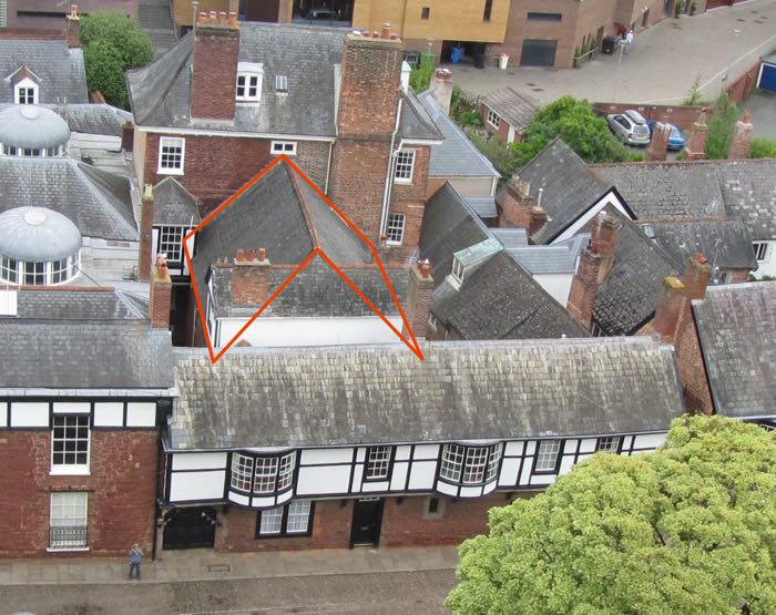 This house at the rear of 8 and 9 Cathedral Close is a handsome building that is often overlooked, as it faces the rear of Princesshay. An entry in the Dean and Chapter Act Book of 1692 said that the "most and the Chiefest part” of the property "was lately burnt down”. The actual damage was contained by the thick Heavitree stone walls, to the northern section of Nos 8 and 9, while the hall, east and south ranges escaped the blaze.