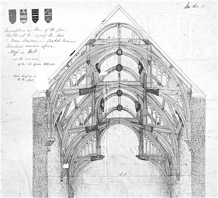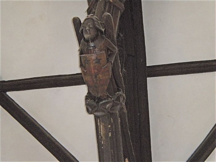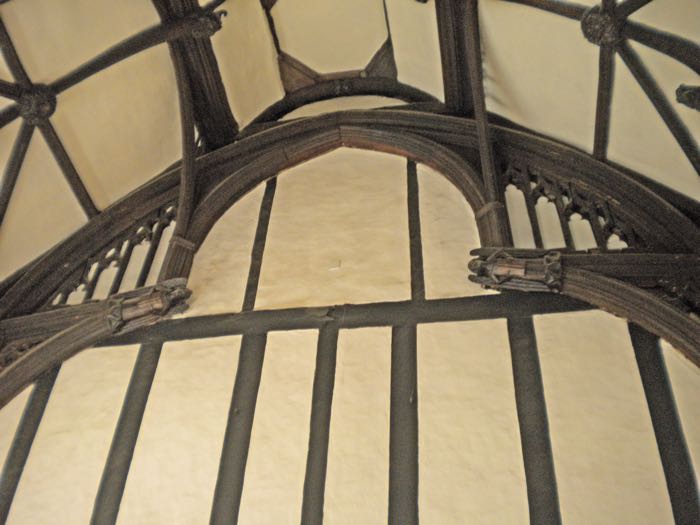 Beyond the open passage on the right is the entrance to the building’s very real claim to historic glory—the hammer beam roof, the construction of which is similar in style to that of Westminster Hall. Cores from the timber dates the construction of the roof to between 1417 and 1442. Supported by four timber trusses, the two central trusses that divide the roof into three are supported by ornamental stone corbels, carved into angels and lions. There are eight wooden angels, each placed at the end of a hammer beam forming one side of a triangle, supported by a curved brace, both attached to the vertical wall beam. The three sides of the triangle are carved from one piece of timber. A unique aspect of the roof is the curved, or barrel vault at the top. This design can only be found in Devon, sharing the feature with the Guildhall, the Archdeacon’s house at Palace Gate, Bowhill and Cadhay (the barrel vault was removed in the 1730s). There are six opposing carved lions at the base of the rafters, each carved from a piece of oak. There are numerous other carvings at the intersection of purlins, wind-braces and rafters, including a depiction of Jesus, a king, a bishop, and assorted other faces.