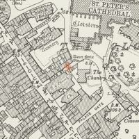 In 1812, the Cathedral decided to remove the chamber over Bear Gate "leaving a Gateway of the same breadth and height as at present and to be shut as usual." The gates were also to be removed and temporary posts and chain installed to prevent passage through the gate "for the usual hours at night as often as the Chapter shall think fit...and at least on Midsummer Day in every year." By the next year, Robert Cornish surveyed the gates around the Close and concluded that Bear Gate should be totally removed and replaced with an iron gate.