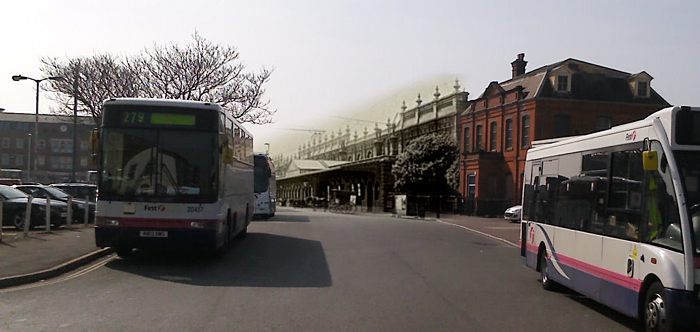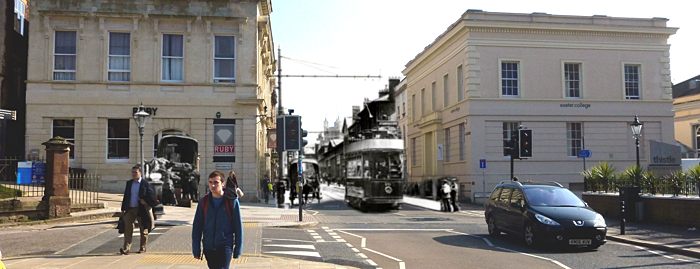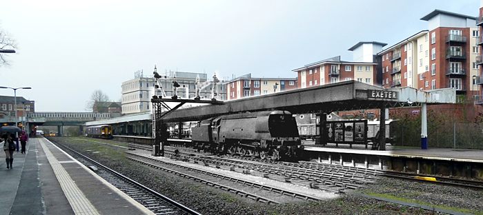 Originally called Queen Street Station, the London and South Western Railway kept the line into Exeter busy. The modern access to the platforms from New North Road is shown in this mashup of steam trains.