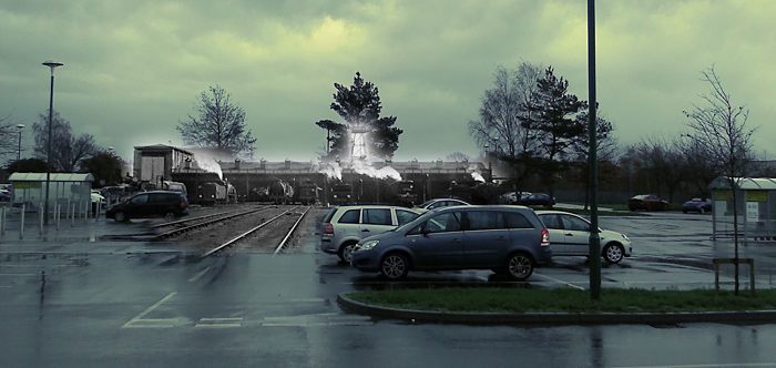 Steam locomotives emerge from Morrisons, in this mashup of Exmouth Junction.