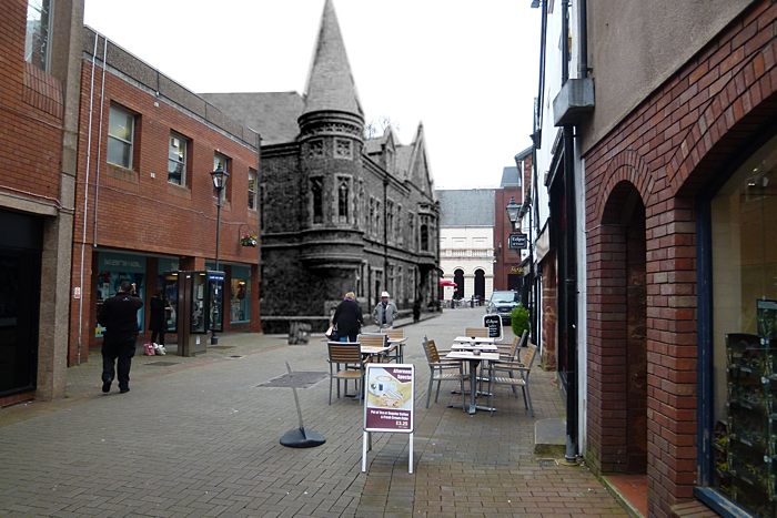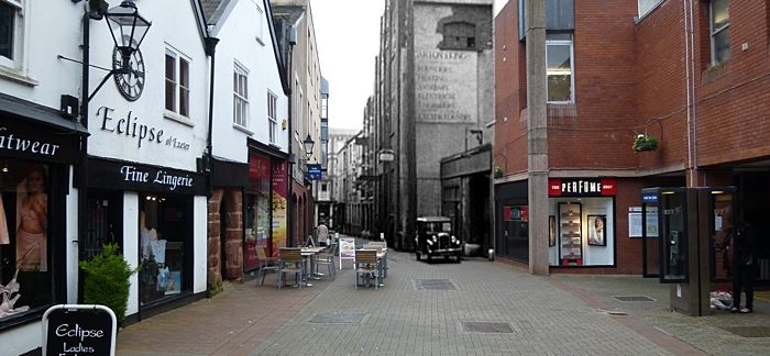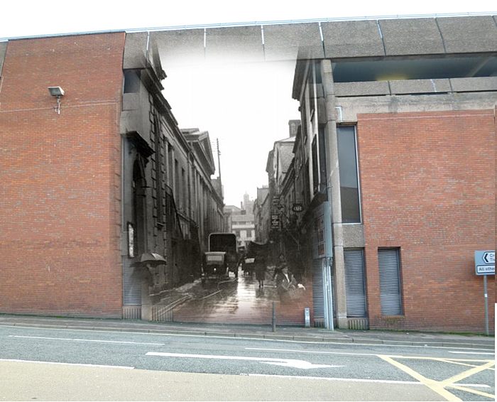 Goldsmith Street would have cut through W H Smiths to emerge into Paul Street, through this anonymous wall. St Paul's Church was on the left corner.