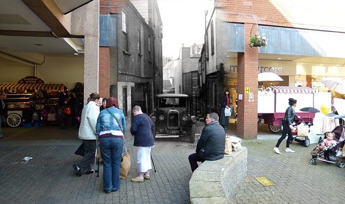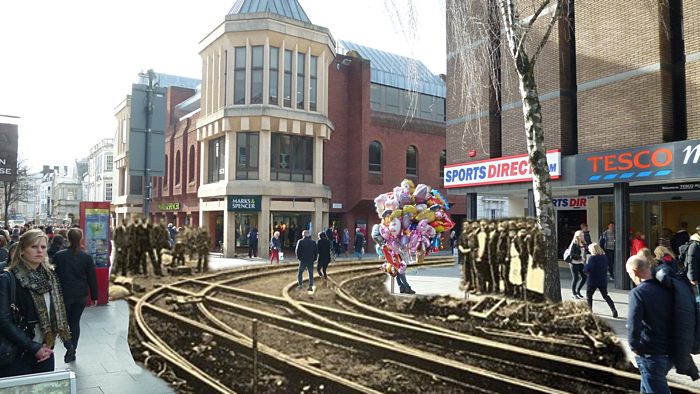 A mashup of the Queen Street and High Street junction, showing the laying of the tram lines in 1905, with the modern Marks and Spencer in the background.