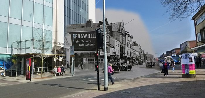 Sidwell Street was much narrower, before it was partly destroyed by the bombs, and demolished in the 1950s and 60s. This mashup gives a good idea of how far back the new line of shops is set.