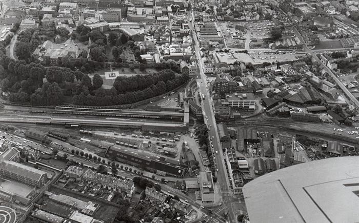 The City Council rejected the first plan to rebuild the station, and it was not until 1931 that a revised design was accepted. A brick built station complex was constructed while the lines and platforms remained open for passengers. A large three storey station building on the down platform was constructed along with a crescent shaped entrance building, fronted with shops, facing Queen Street. The crescent was deliberately designed to enable cars and taxis to draw up, and drop passengers, a lesson that has been forgotten by Railtrack with latest reorganisation which has pedestrianised the whole frontage. The crescent is placed to the right of the lines looking from Queen Street giving an entrance to both platforms from the central entrance of the crescent, while a side entrance for goods was provided to the right of the crescent, beneath the gate to Northernhay Park. In the centre of the crescent is a bell tower. The new station was opened on 1st July 1933 with the new name of Central Station.