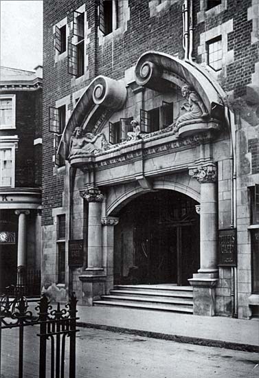 The grand, Baroque scrolled entrance pediment, beneath which were two reclining sculpted female figures over columns, on either side of the door. A suitable entrance for a magical interior.