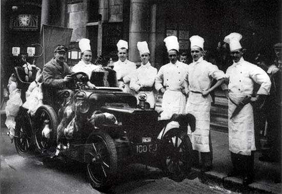 Kitchen staff line up to take delivery of grouse and pheasant, tied to the side of the car. This is an early photograph from 1916.