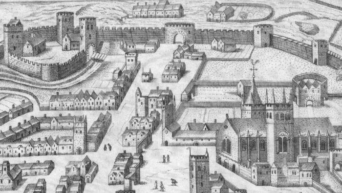 During the first years of the 17th Century, the porters lodge became a popular place to drink, play cards and no doubt, gossip. A few years later, and the occasional tavern had moved to an upper floor, for Mr Newberry was reported to the city authorities for 'for keeping of ill-rule in his house'. Just before the Civil War, a 'wyne bushe' was hung outside, to indicate that drink could be obtained there. The Puritan rulers of the city were not amused by such goings on. By the 18th Century, the rooms were formally known as the Salutation Inn.