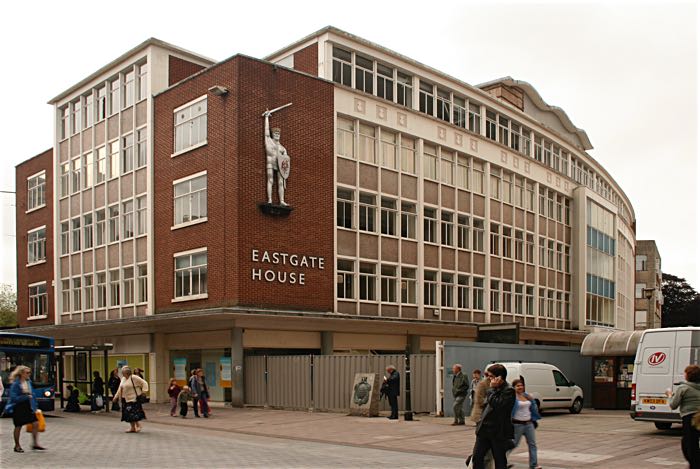 The Eastgate House that was demolished in 2005 had its seeds in a building dating back to the 1930's. The Co-op built a modern structure of concrete, on the site of the old Cathedral Dairy. Alongside, in the High Street was the 19th-century Eastgate Arcade, that stretched to Southernhay. The blitz of 1942 destroyed all the surrounding buildings, but the Co-op miraculously survived. It was said that the firewatchers flung the incendiaries off the roof to land on the Arcade, which was destroyed as a consequence. A report at the time stated: