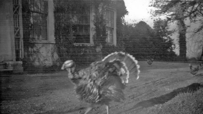 The only known photo of Haccombe House. Taken in the 1940s, when the house was occupied by a family from London, it shows a small part of the front facing Exeter, and of course, a turkey! Photo Mike Kan.