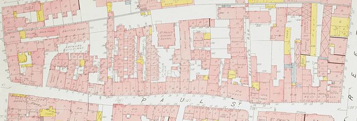 The corner of Queen Street (1 Harlequin Centre) houses Chandni Chowk, an ethnic furniture and interior design shop. Previously on the corner site was the Official Information Bureau, a single storey building with mock timber work and cream panelling, which was demolished in 1980. The bureau was taken over by the Council in 1974, having previously been sponsored by local business, who formed a committee to direct its work. The Paul Street Bus Station was created in 1929 after the area between Paul Street and the city wall was cleared in 1921 to 1925. Before that, a variety of houses and terraces occupied the area.