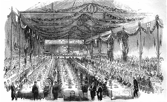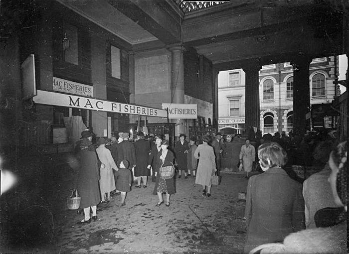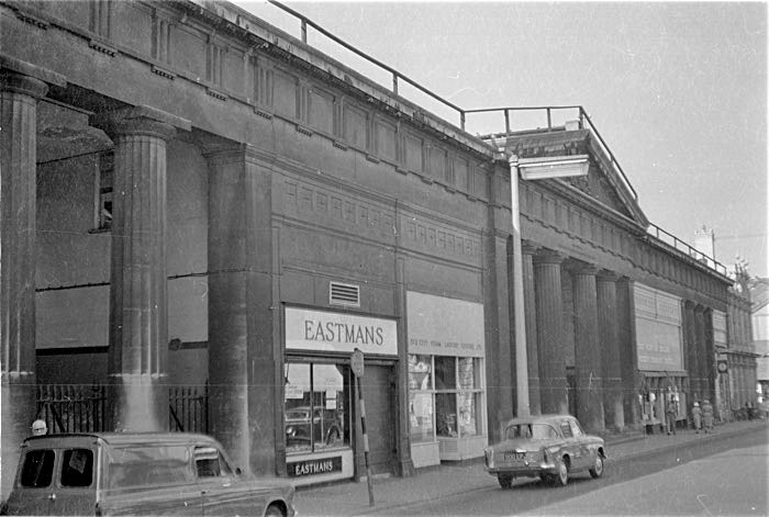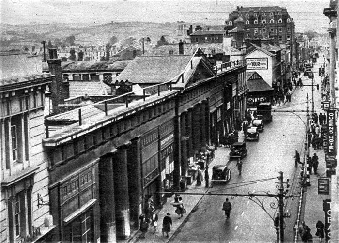 Because it was such a large space, the market hall was occasionally used for other functions. In October 1859, the Earl of Cardigan inspected the 9th Lancers at the barracks. After, a grand banquet was given in the market-hall for the soldiers and their women, who had recently returned from India. Also in attendance were the Mayor and High-Sheriff of the city along with representatives of trade and commerce. Late in the 19th century, shop-fronts were installed along the Queen Street front of the Higher Market, requiring the removal of some pilasters on each side of the central Doric column area. Greenslades Tours, H Quick & Co wholesalers of leather and others traded from here.