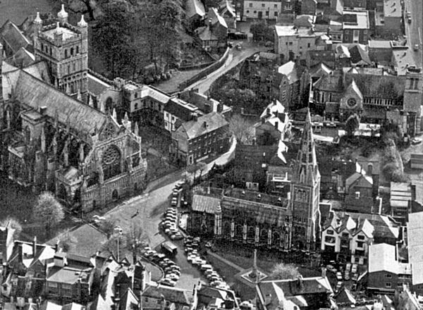 The Three Gables, in red, before St Mary Major was demolished. Courtesy Express and Echo.