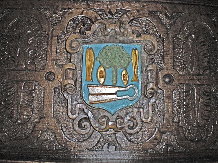 The guild's coat of arms with a weavers shuttle, two burling irons, teasel frames and a pair of tuckers shears.