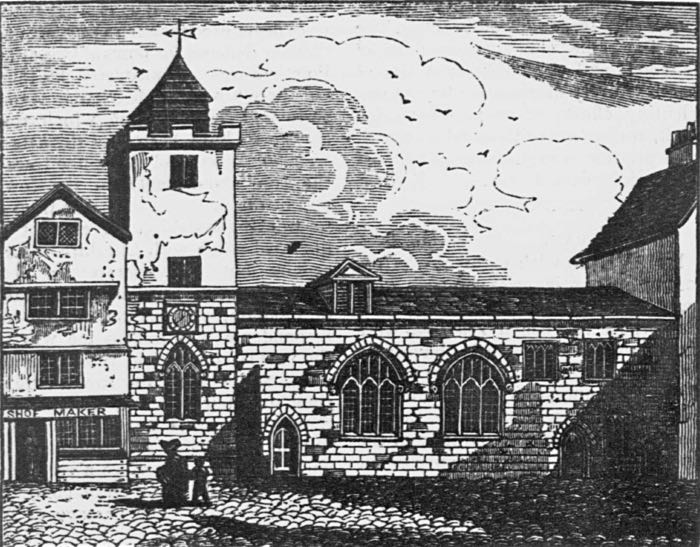"The sketch from which the present wood-cut was made, was taken from an opposite window, on 1st August 1830, at which time the demolition of the Church was talked about. A crack was visible in the north wall; but probably the fondness for improvement which had led to the building of several churches in the city, was the actual cause of its demolition. The protecting Genius of the Church would exclaim ‘repair’, but ‘not destroy;’ but this small still voice would be drowned in the yells of the Demon of Improvement."