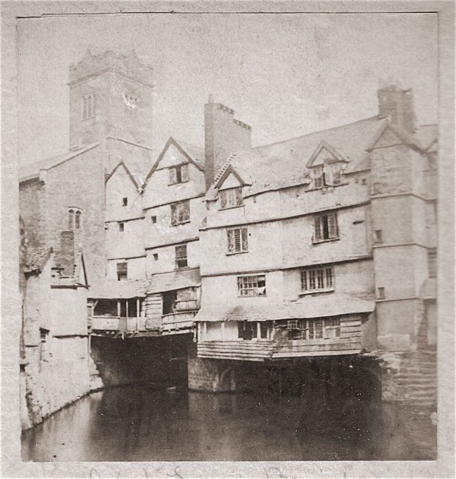 An early photo of St Edmund's from Bridge Street. The house mentioned left is the house abutting the wall. The old bridge was narrow so the church was built on columns to the side of the roadway, and the houses were supported on wooden beams and the piers of the bridge.