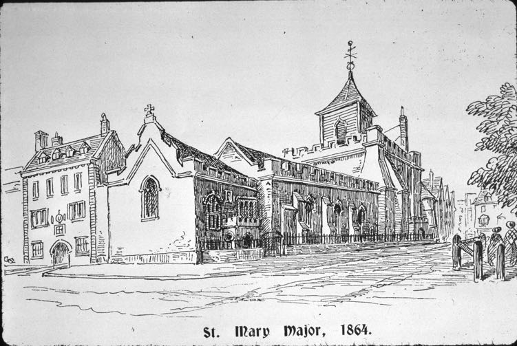 In 1864, consideration was being made to demolish and rebuild St Mary Major. The parish had a population of 3,700, and in a time when church attendance was much higher, it was thought that a new church of 600 sittings was required. Some in the city were aware of the loss of ancient architecture and in May 1865 the Diocesan Architectural Committee discussed the demolition. A member, Mr Drake remarked: