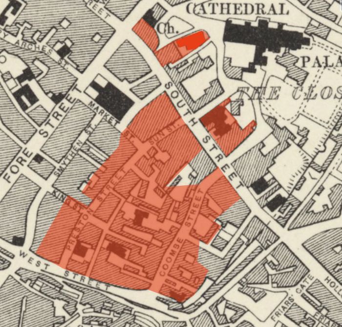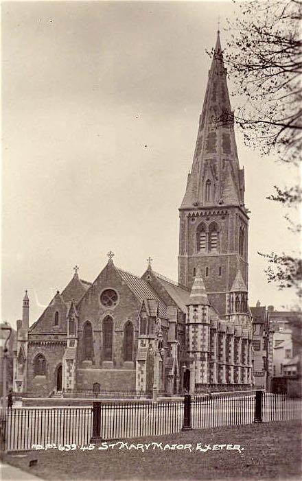 The Parish of St Mary Major was split into two parts. A small block of buildings at the top of South Street, adjacent to the church, and a large area of the West Quarter, to the south, stretching from the south side of South Street down to West Street and the city wall at the South Gate; there was also a small block of buildings by Bear Street and Palace Gate. See Exeter's Parishes. The register for the church, and its Victorian replacement, starts from 1561 and are available at the Devon Heritage Centre.