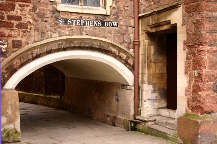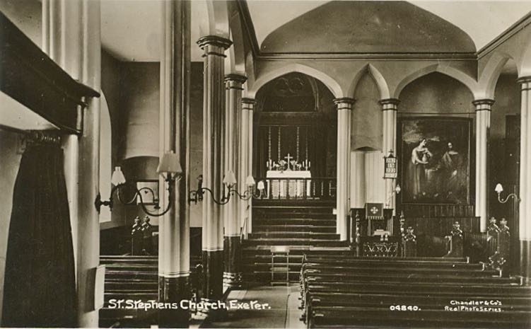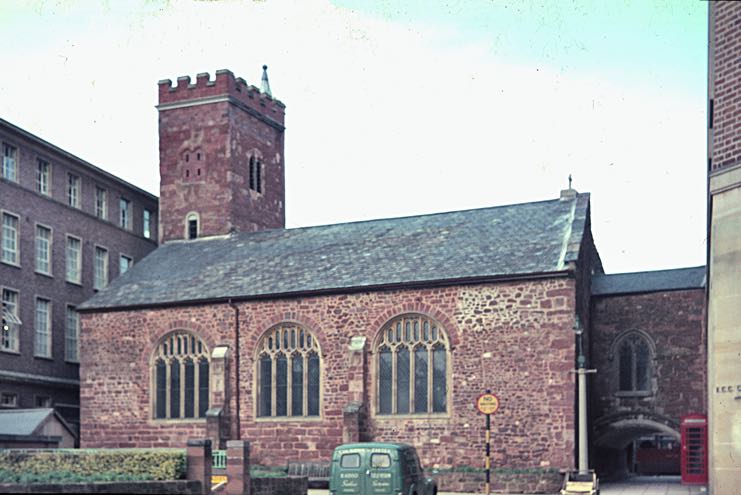 St Stephens Church on the High Street in central Exeter, may have been built by a wealthy patron for the use of his family. The church was first mentioned in the 1086 Domesday book, although the crypt, unearthed in the 19th century is probably of Saxon origin. Sited on the mid-point of what is now the High Street, it is thought that its position may be owed to the Roman layout of the city. It was opposite a medieval guildhall, pre-dating the present structure further along the High Street.