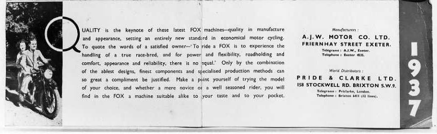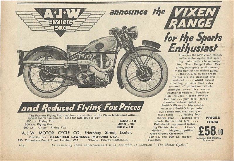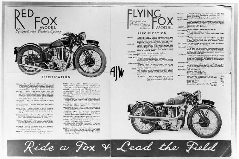 At the 1928 Olympia Show they announced the AJW Super Four utilising an Anzani water-cooled engine, eight-inch drum brakes and four inch tyres. It was exhibited at the 1929 Olympia Show, but it never went into production. Marketing was through Pride and Clarke in the Old Kent Road, London. One of the most famous AJW creations was the 'Grey Fox', but the company also produced a range of bikes with names including the Silver Fox, Silver Vixen, the Vixen, Flying Vixen, Flying Fox (with a Rudge Ulster engine) and the Speed Fox.