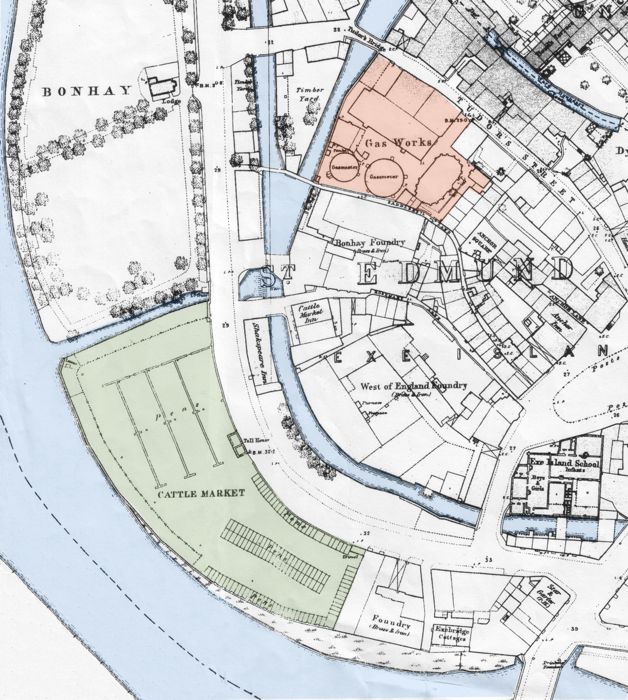 The council purchased an enclosure on the Bonhay, just north-west of the Exe Bridge, between Princess Road (now Bonhay Road) and the river. It was announced on the 15 May 1839, that the first cattle market was to be held. They may have jumped the gun, for the Western Times reported in the June: