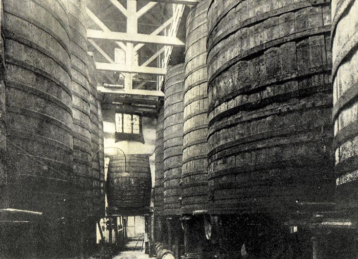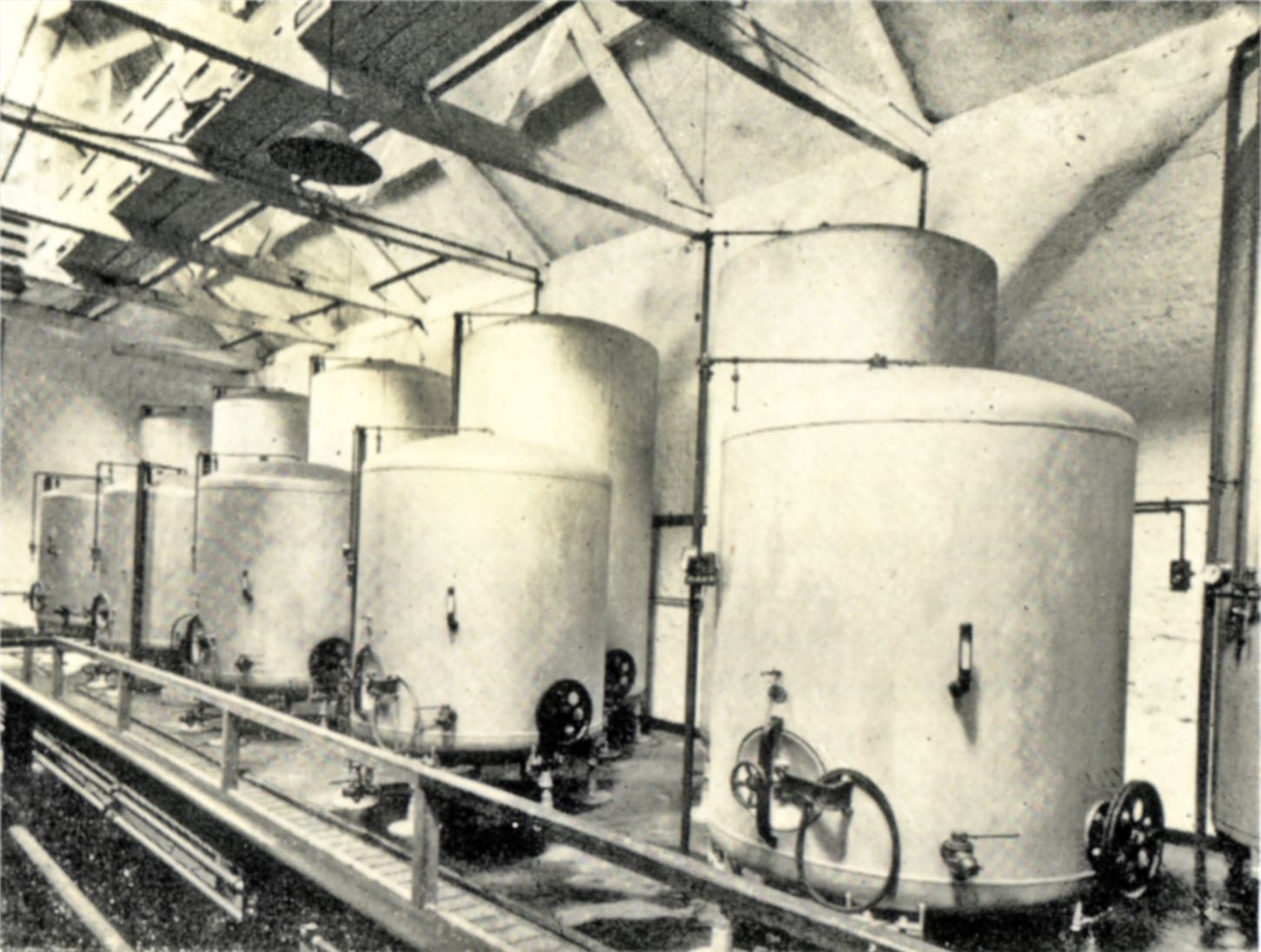 The Commercial Road premises was a prominent site on the old Exe Bridge, overlooking the river. Cellars, parallel with the road contained large vats of 310 barrel capacity for storing stout and porter. From 1454, an English barrel contained 36 gallons of beer or 32 gallons of ale giving 11160 gallons per vat. The vats were removed in the 1920's and replaced with glass-lined conditioning tanks for the increasing bottled beer trade. A bottling store between Commercial Road and Frog Street was also commissioned in the 1920's, followed in 1937 by the first automatic bottling plant.