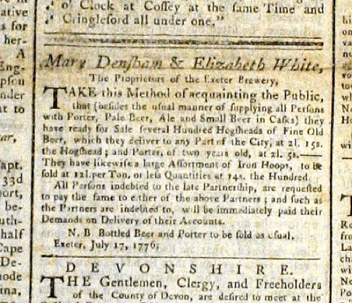 On 15th September 1760, a lease was agreed by the Mayor, Bailiffs and Commonalty of the City of Exeter to Richard Densham who built a cellar and warehouse on the site beside the Common Brewhouse. Situated on the old Exe Bridge, the site it had a leat running behind and the river in front. Richard Densham went into partnership in 1786 with Samuel White and over the next few years, the brewery took on other partners. An advert in Andrew Brice's Old Exeter Journal of July 1776 gives the proprietors of the Exeter Brewery as Mary Densham and Elizabeth White. It refers to the late partnership and lists the products and prices per hogshead from the brewery. This was a brewery supplying local inns, taverns and large households and individuals. The first lease to mention the City Brewery was dated 1801.