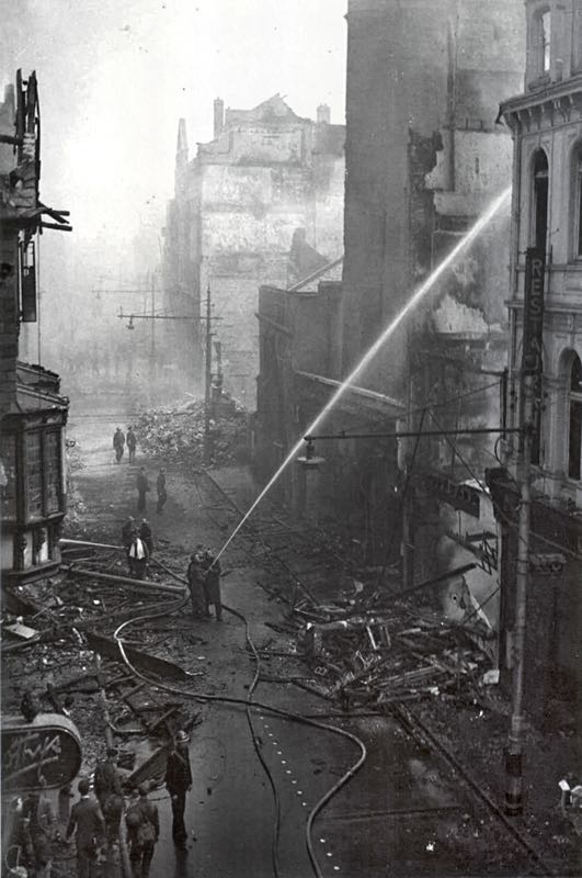 The bomb damaged premises around Colsons had succumbed to the flames and the fire spread into the top floor and roof of the store. The rest of the building was only saved by the timely action of the fire services and a 4ft 6in cob wall that held the flames back.