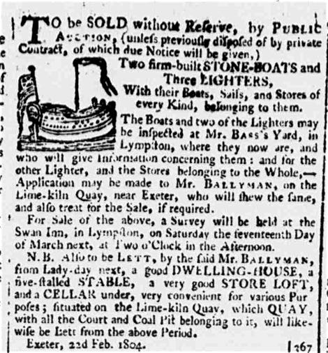Newspaper records before 1800 are not generally available. The earliest after 1800 is an advert in 1802 to let the lime kilns “a little below the Quay”. Included in the let were two stone boats, three lighters with sales, ropes etc., carts. Mr William Ballyman was named as the contact and was one of the proprietors. By the end of the year an advert appeared (see left) that the kilns had not been let, and that the equipment would be sold, and the kilns and buildings let for other uses. It would appear that the kilns were eventually let, and lime was continued to be burnt.