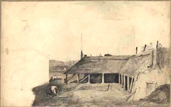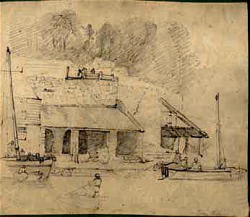 1805 Hayman's map shows the kilns between the river and the Bowring rackfields. This map seems to indicate five kilns.