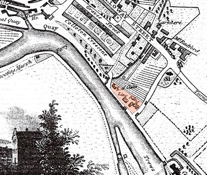 Lime burning for both agriculture, and building goes back to at least the Romans. There were several lime kilns around Exeter; Countess Wear, Topsham and on the canal bank near Exminster being three well known locations. The most central were the kilns just above what was known as St Leonard's Quay, a few yards up river from the Port Royal pub; indeed there is evidence of a kiln by the Port Royal itself.