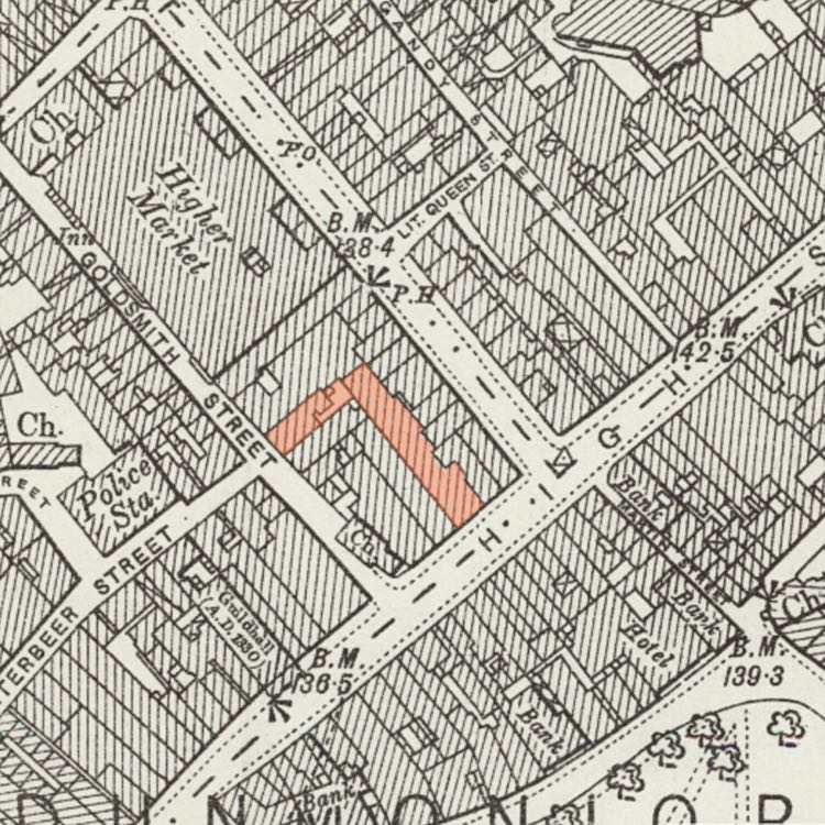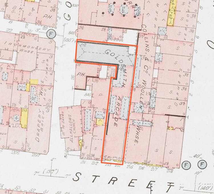 The shop at 213/214 High Street extended in depth, for about 150ft from the front facade. The opportunity to buy the premises in Goldsmith Street, adjoining the end of his shop must have come up in early 1887, because J G Stephens of Fore Street won the tender to construct the Goldsmith Street facade, and construct and fit out the length of the whole arcade. The architect and surveyor was Messrs Wilkinson and Warren.