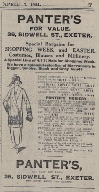 Samuel Charles Panter was born in 1869 in Landrake Cornwall. A market trader, he moved to Exeter at the age of 25 and opened his drapery store at 36 Sidwell Street in 1894. He married Miss Kose Lee, on 15 April 1895 and had two children–a daughter who died young, and a son Stanley, who followed him into the business. His bride was the sister of a future Bideford mayor. For the next few years, Panter placed small ads in the local press, for apprentices to work in the drapery trade, and for experienced staff, such as milliners.