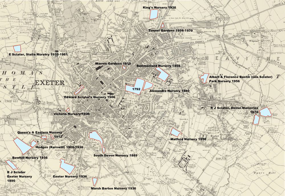 The Sclater family were nurserymen based in Exeter from the early 18th century until 2006 when the last of their nurseries was sold. Family members leased and owned land all over the city for 250 years, and will have often been in competition with each other.