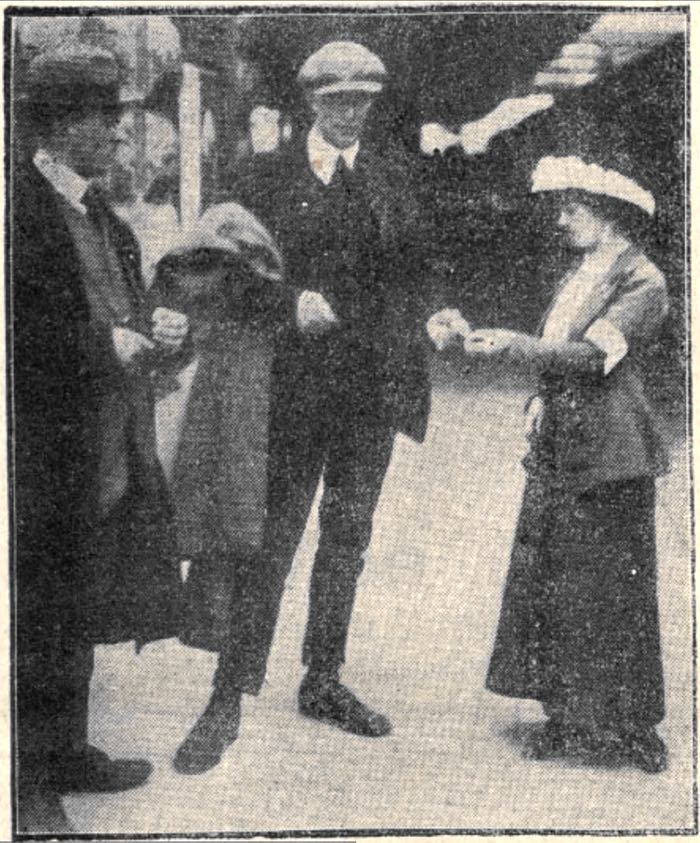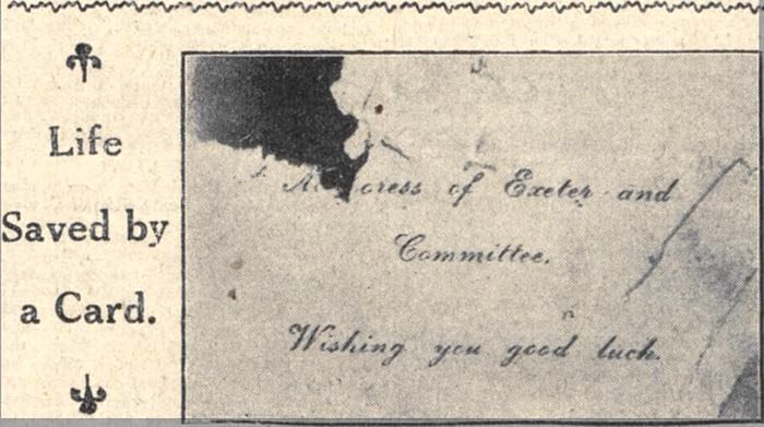 How two small sherks have contributed to feed 216 soldiers, or, rather, to do the whole thing off their own fins—so speak—is very interesting Exeter war story—a sort of modern miracle. At the end of last week the two small sharks were caught, and Mr. A. Williams, 10, Northernhay-place, saw in them an opportunity of helping the Mayoress's Depot. Mr. French, of Paris-street, lent a vacant shop in St. Sidwells. Messrs. Rouse, Pullen, Pratt and Pennington joined Mr Williams as a sort of Emergency Committee, posters were got out, and the sharks were ready to hold their reception. The public showed a proper curiosity, and contributed right willingly to the collecting box. The result was that Mr. Williams had the pleasure yesterday handing over £5 8s to the Mayoress for her Hospitality Fund, after deducting a trifle of 11s 6d for necessary expenses. Five pounds eight shillings equal 216 sixpences, and that is how it happens that two small sharks will feed 216 soldiers on their their way through Exeter to some destination unknown, as the officials say. Naturally the ladies of the Mayoress' Depot are very pleased.