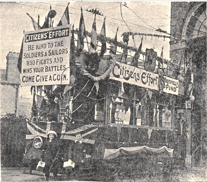 The decorated tramcar that last night made a tour of the city, with collectors, in aid of the Mayoress of Exeter's hospitality fund for soldiers and sailors.