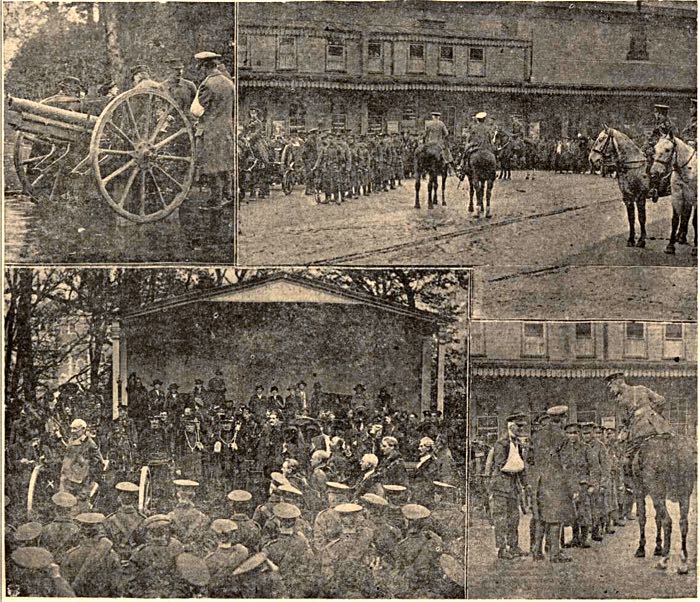 Two of the German guns captured by the 8th and 9th Battalion of the Devonshire Regiment have been brought to Exeter and handed over by the military authorities to the Lord-Lieutenant of the County. They were subsequently drawn through the city, and lodged on Northernhay. (1) One of the guns; (2) The handing over ceremony at Queen Street station; (3) Col Walsh, commanding No. 8 District, calling for cheers for the Devons; (4) The Lordl-Lieutenant chatting to some of the heroes of Loos.