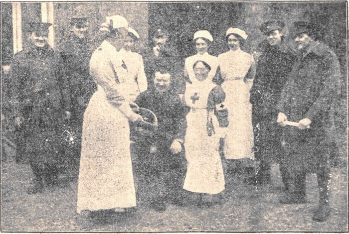 Arrangements had been made by the local V.A.D authorities for the reception of more wounded soldiers from the Front at Exeter early last evening. They were due to arrive at Queen-street Station at 7.15 p.m., and after being drawn on to the down platform the ambulance train was shunted, as usual, on to the up platform. The men were then conveyed by the V.A.D ambulance staff, assisted by the local officers and members of the St. John Ambulance Brigade, to the motor-cars waiting in the station yard, and thence despatched to the local Temporary Hospitals. The men arrived at Southampton from the Front yesterday, and sixty were allotted to Exeter, about twenty of these, from various regiments, being cot cases. On the same train were a number of other men from the Front, who were sent the Plymouth Hospitals after the V.A.D. staff had served out hot drinks and refreshments to them at Queen-street Station.