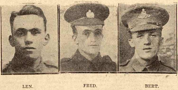 The above are the three sons of Mr. and Mrs. W. Money, Regent-street, St. Thomas, Exeter. Len, of the Devons, has been returned as missing, believed killed, Fred, of the Royal Engineers, has been mentioned in despatches, and Bert, of the Royal Garrison Artillery has been twice wounded.
