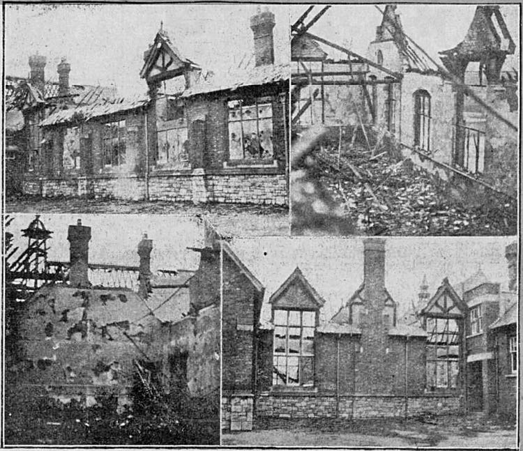 ONE of the most destructive fires experienced in Exeter in recent years occurred at St. Thomas (Okehampton-road) Council Schools early Friday evening. Mysterious in its origin—some think it began in a room at the rear of the premises owing to a coke stove, used for warming the building being overheated and igniting the woodwork—it spread with amazing rapidity, and the whole school was in a very short time a mass flames, whose tongues shot upward, high and fiercely. It was a wonderful and weird sight for the hundreds who quickly gathered to the scene. Dense volumes of smoke belched forth, being borne seaward on a gentle breeze—black clouds of disaster. Half-molten glass fell from every window, and there was continual clatter of sliding slates and tiles and falling debris as the roofs turned red and collapsed into the interior. The Exeter firemen, promptly answering a call, fought stubbornly with the flames, and it is no doubt due to the admirable efforts Supt Pett and his men, coupled with the good fortune of the wind being in a favourable direction, that Emmanuel Church, separated from the schools only by passage way, did not become involved. It was a good piece of luck, too, that the fire did not break out until after the 400 children attending the school had returned home for their teas. Everything seemed all right when Miss Newcombe, the Head Mistress, who was the last to leave, had a final look round. The above "snaps," taken by the "Western Times" photographer afterwards, give some idea of two thousand pounds' worth of damage which was done. Arrangements have been made for the children to continue their education at other schools in the vicinity.