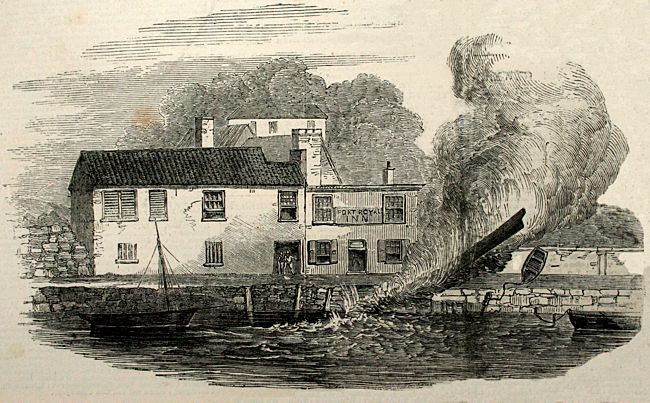 On Saturday afternoon last, between the hours of three and four, whilst working in his shed, his attention was arrested by a loud rushing sound, which proceeded from a path immediately outside the building. On hastening thither he saw large stones, dust, etc., taken up as in a whirlwind, from a space on the ground as large as a coach-wheel. The revolving column gradually drew towards a small punt afloat in the adjacent river and moored to a post by the bank; the boat was then lifted as high in the air as the painter would allow, and was held there by the force of the wind, spinning round like a top. The column then moved on towards a four-oared gig, moored in a similar manner; when simultaneously the punt fell and the gig was elevated precisely from the water, whilst the stern was raised about fifteen feet. The column then seemed to have expanded its strength and fell, so to speak, in water, with the noise of a ton weight, dashing and stirring up the bed of the river with foam. The gig is thirty feet long and had in her at the time such was taken up from twelve to fifteen gallons of water: she has been rendered quite useless. What renders the occurrence the more remarkable is that at the time scarcely a breath of wind was stirring, and the sky was nearly cloudless.