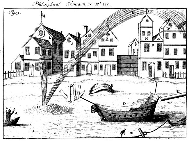 The marks +++ shew the River, the Letter O the Spout. The Letter S Mr.Seaward’s House (who was an Eye-witness of it) which it gently touched with little or no Damage, blowing only off a few Tiles. The Letter G the House of one Widdow Goldworthy, which it in part uncovered, took off almost all the Thatch of her Garden Wall, brake down a large Limb of a Plumb-Tree which stood at the higher end of her Garden, and which is more Remarkable than all the rest, it took off an Apple-Tree which was no way decay’d, and between fifteen and sixteen Inches about, within two or three Inches from the ground, almost as exactly as any Saw could have done it, and carried it, as I judge, (for I did not measure it) between Twenty and Thirty Foot from the place where it grew, and that not forward in the Path that it took, but almost directly backward, which makes me conclude that it had a double Motion; the one external from the Wind strait forward, the other internal and circular, like the Fly of a Jack, which a Man may carry in his Hand, that will strike anything either forward or backward as it meets with it. G with a Bar under it shews you Mr. Greens House, which was for the most part untiled, and backward in the Court there was a Linny that rested upon a Wall, which indeed it heaved a little out of its place, part of it hung on one side of the Wall, and part on the other; but not broken in pieces, nor much injured, it having been since restored to its proper place. The Letters WL shew you two Houses more that were very much damaged in their coverings, which is the more Remarkable, for that Mr. Moxam’s House, marked M M, though it stood between the Injured Houses, and was much higher than either, had only two or three Quarries of Glass broken. E E E E E shews the march of the Spout. The Letter X the Planks that were blown some upright, some several Yards out of their place. D a Ship newly launched, of about One Hundred Tuns, which was much shaken, but not hurt. K a Mast of near a Tun weight, thrown out of its place. W the Anchor that was torn out of the Ground, and carried seven or eight Foot with a Boat that was fastened to it, and blown up into the Air, that Boat was rent from the Head to the Keel. B another new Boat blown about six Foot high, and turned upside down. A a Fisher Boat with one Man in it, which was near the place where the Spout was at first perceived, but through Mercy escaped. LA a Lane that goes from the River, in which some Houses suffered Damage, which shews that the Spout was divided in its march. ’Tis no small Mercy that no Man, Woman, or Child received the least Injury in their Persons. God shews us what he can do, happy we, if we understood his meaning, and comply with it; but alas, Mercies and Judgments are soon forgotten.