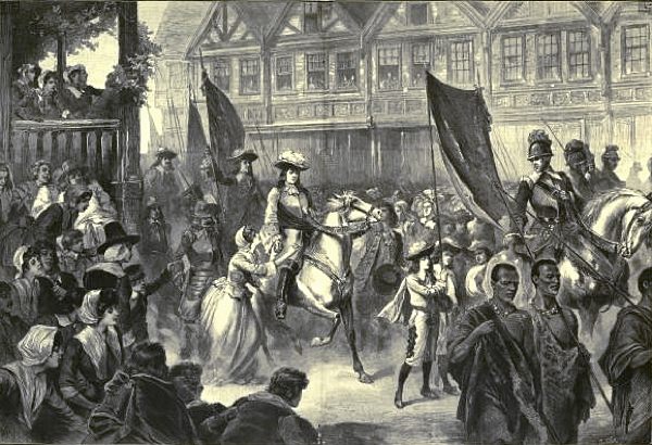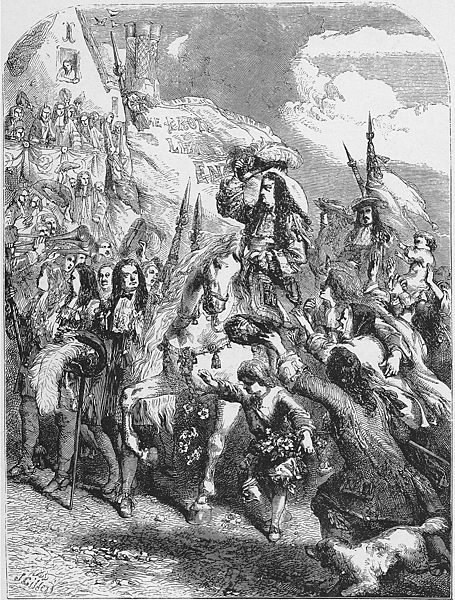 "Such a sight had never been seen in Devonshire. Many went forth half a day's journey to meet the champion of their religion. All the neighbouring villages poured forth their inhabitants. A great crowd, consisting chiefly of young peasants, brandishing their weapons, had assembled on the top of Holdron (sic) Hill, whence the army marching from Chudleigh first descried the rich valley of the Esk (sic), and the two massive towers rising from the cloud of smoke which overhung the capital of the west. The road all down the long descent, and through the plains to the banks of the river, was lined mile after mile, with spectators. From the West-gate to the Cathedral-close, the pressing and shouting on each side were such as reminded Londoners of the crowds on the Lord Mayor's-day. The houses were gaily decorated; doors, windows, balconies, and roofs were thronged with gazers. An eye accustomed to the pomp of war would have found much to criticise in the spectacle. For several toilsome marches in the rain, through roads where one who travelled on foot sank, at every step, up to the ancles in clay, had not improved the appearance either of the men or of their accoutrements. But the people of Devonshire, altogether unused to the splendour of well-ordered camps, were overwhelmed with delight and awe. Descriptions of the martial pageant were circulated all over the kingdom. They contained much that was well fitted to gratify the vulgar appetite for the marvellous; for the Dutch army, composed of men who had been born in various climates, and had served under various standards, presented an aspect at once grotesque, gorgeous, and terrible to the islanders, who had in general a very indistinct notion of foreign countries. First rode Macclesfield, at the head of two hundred gentlemen, mostly of English blood, glittering in helmets and cuirasses, and mounted on Flemish war-horses. Each was attended by a negro, brought from the sugar plantations on the coast of Guiana. The citizens of Exeter, who had never seen so many specimens of the African race, gazed with wonder on the black faces, set off by embroidered turbans and white feathers. Then with drawn broadswords came a squadron of Swedish horsemen in black armour and fur cloaks. They were regarded with strange interest; for it was rumoured that they were natives of a land where the ocean was frozen, and where the night lasted through half the year, and that they themselves had slain the huge bears whose skins they wore. Next, surrounded by a goodly company of gentlemen and pages, was borne aloft the prince's banner. On its broad folds, the crowds which covered the roofs and filled the windows read with delight that memorable inscription, ' The Protestant Religion and the Liberties of England.' But the acclamations redoubled when, attended by forty running footmen, the Prince himself appeared, armed on back and breast, wearing a white plume, and mounted on a white charger. With how martial an air he curbed his horse, how thoughtful and commanding was the expression of his ample forehead and falcon eye, may still be seen on the canvas of Kneller. Once those grave features relaxed into a smile. It was when an ancient woman, perhaps one of the zealous Puritans who, through twenty-eight years of persecution, had waited with firm faith for the consolation of Israel—perhaps the mother of some rebel who had perished in the carnage of Sedgemoor, or in the more fearful carnage of the Bloody Circuit—broke from the crowd, rushed through the drawn swords and curvetting horses, touched the hand of the deliverer, and cried out that now she was happy."