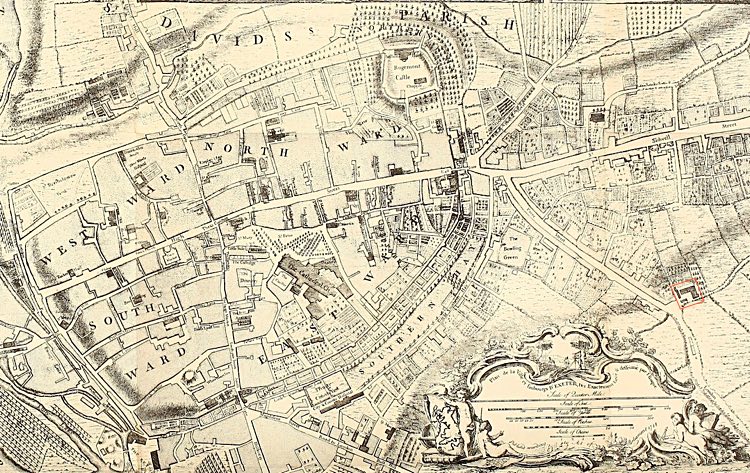 The workhouse is shown as an L shaped building with other structures around, in the section of Roque's map shown above. Another map indicates it as a three sided building with a courtyard.