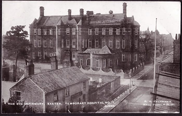 The entrance has a large 18th century marble fireplace that was taken from the former house on the site, and a decorated marble terrazzo floor covers the ground and part of the first floor. It had four wards, a state of the art operating theatre, an 18 person lift, an acre of gardens and cost £25,000. It was known as the West of England Eye Hospital, and offered a 25 bed infirmary. It was considered second only to Moorfields in London. The new hospital was opened on 4th October 1901 by Lady Clinton with the Archdeacon of Exeter giving the blessing. During the First World War, it was designated VA Hospital No 1 for the treatment of soldiers wounded at the front. The hospital was absorbed into the NHS in 1948.