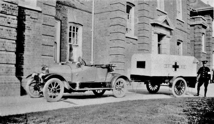 The First War VA Hospital No 3, (Children's Home) with an ambulance trailer hauled by a private car. Photo courtesy Paul Tucker